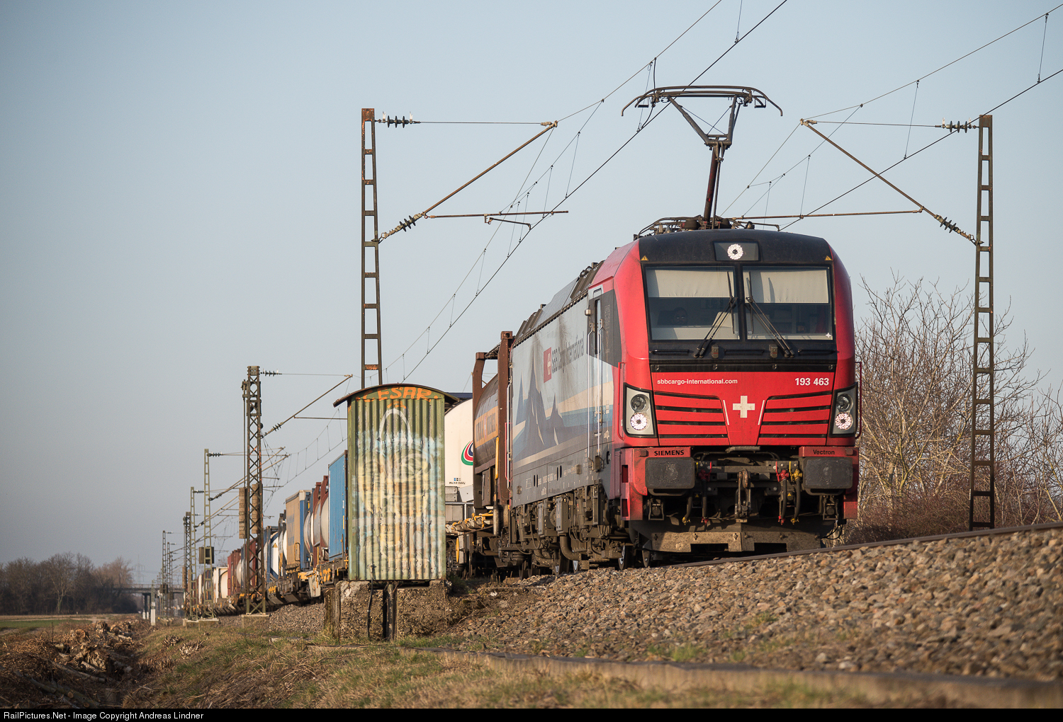 | 193 463-7 with the name "Duisburg" is a locomotive from Siemens Mobility from Munich. It is rented to SBB Cargo International AG from CH-Olten and was here on the way to Basel. |