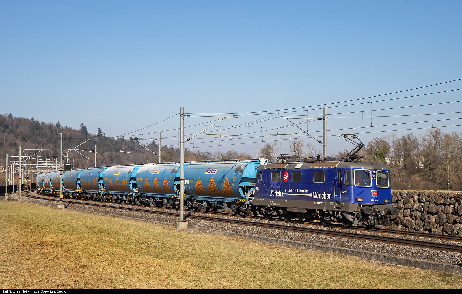 Re 421 # 383 of the SBB, in publicity paint scheme for shorter journey times between Zürich and Munich, is pulling an empty grain hopper train with Tagnpps cars of the "Millet" company from Sursee via Olten freight yard (switchback) to Langenthal freight yard, near Langenthal. In Langenthal freight yard, some more cars of the same type coming from Herzogenbuchsee were added, before the train run to Basel. This was an Interagra grain import from Romania to Sursee and Herzogenbuchsee. Interagra was integrated in the Swiss Fenaco cooperative in 2018.