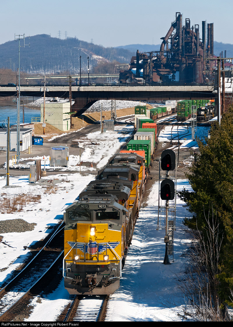 | Back in the days when "foreign" power was still somewhat common on the Lehigh Line...NS 211 was led by a solid consist of Union Pacific units while passing through CP Bethlehem. The head end of NS local H76 can be seen at far right in the River Yard. H76 will return to Allentown Yard shortly after 211 clears the interlocking. |