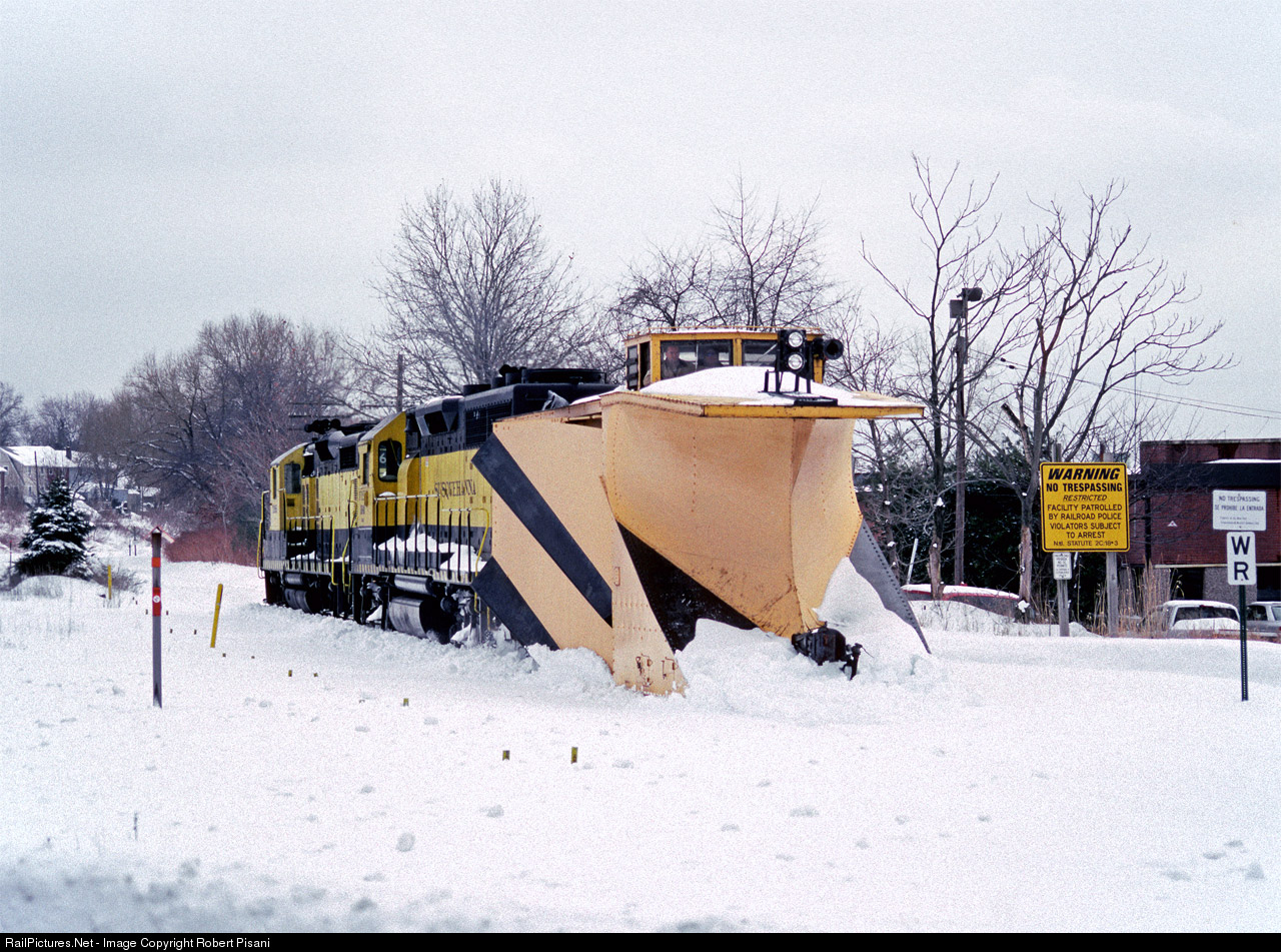 A Susquehanna plow extra slowly heads west out of Ridgefield Park with Russell Plow 92 leading. Power was being provided by GP20 2066 and GP40 3040.
