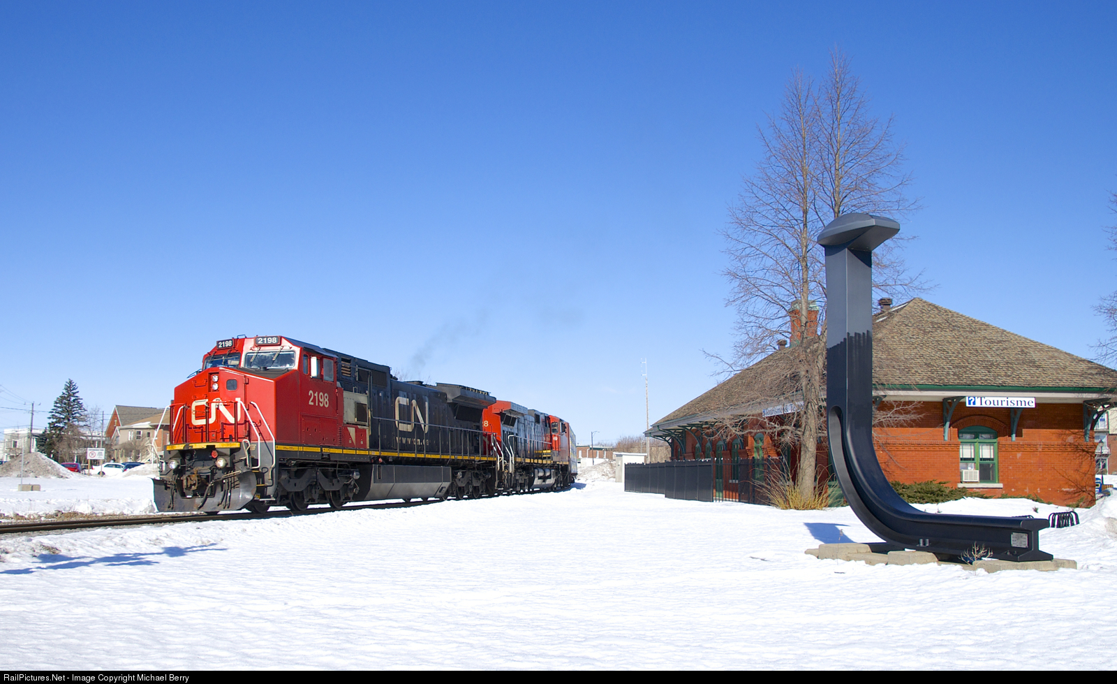 CN 324 with CN 2198 & CN 2528 is passing the ex-Grand Trunk station in St-Jean-sur-Richelieu. At right is an oversized spike to commemorate how this was the terminus of Canada's first railway (the Champlain and St. Lawrence Railroad).