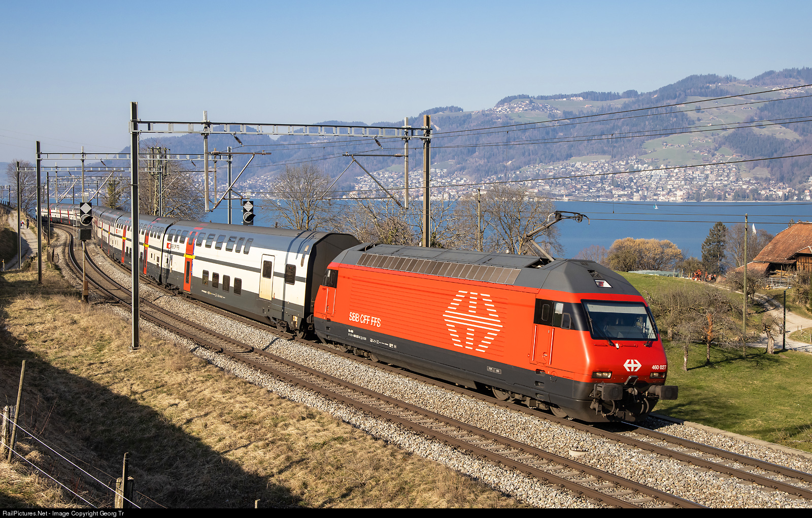 | Re 460 # 027 is one of 5 only which has the SBB symbol in white and the number on the front. The locomotive is pulling the doubledeck push-pull IC 820 of the line IC 8 from Romanshorn via Zürich-Berne to Brig, between Gwatt and Spiez, with the Lake Thun in the background. |