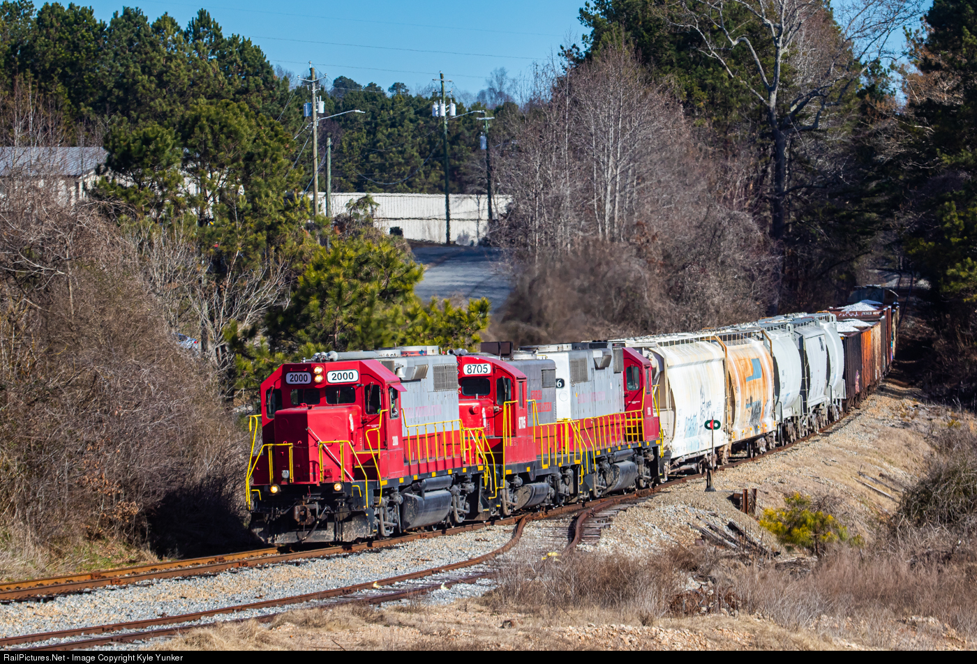 | Georgia Northeastern Railroads Tate - Marietta train rolls south through Holly Springs,GA with GP38's #2000 & #9706 bracketing GP18 #8705. |