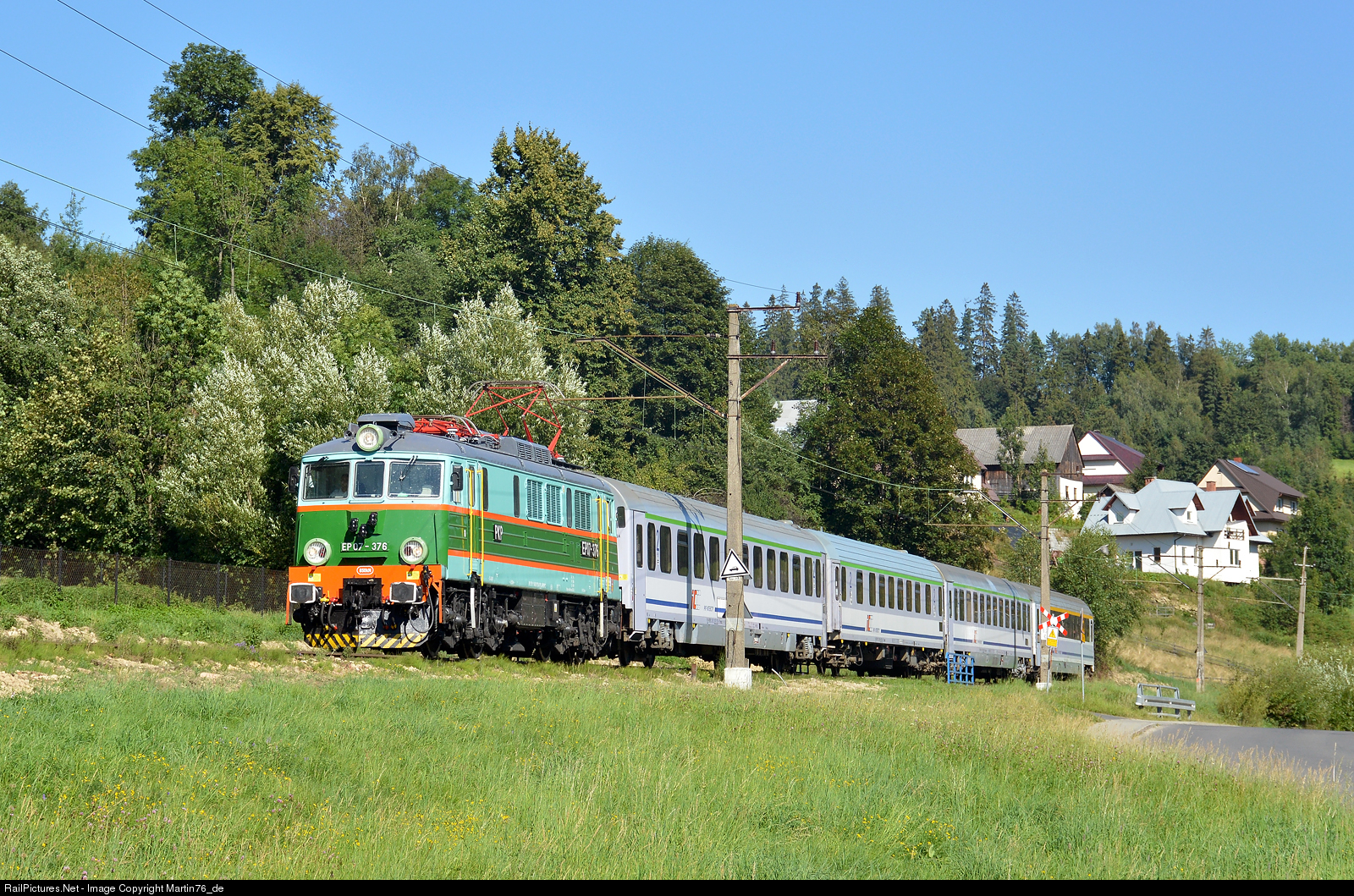 | The electric locomotive EP07-376 hauling a passenger train IC "Oscypek" from Zakopane to Warszawa Wschodnia, approaching the Sieniawa station. |