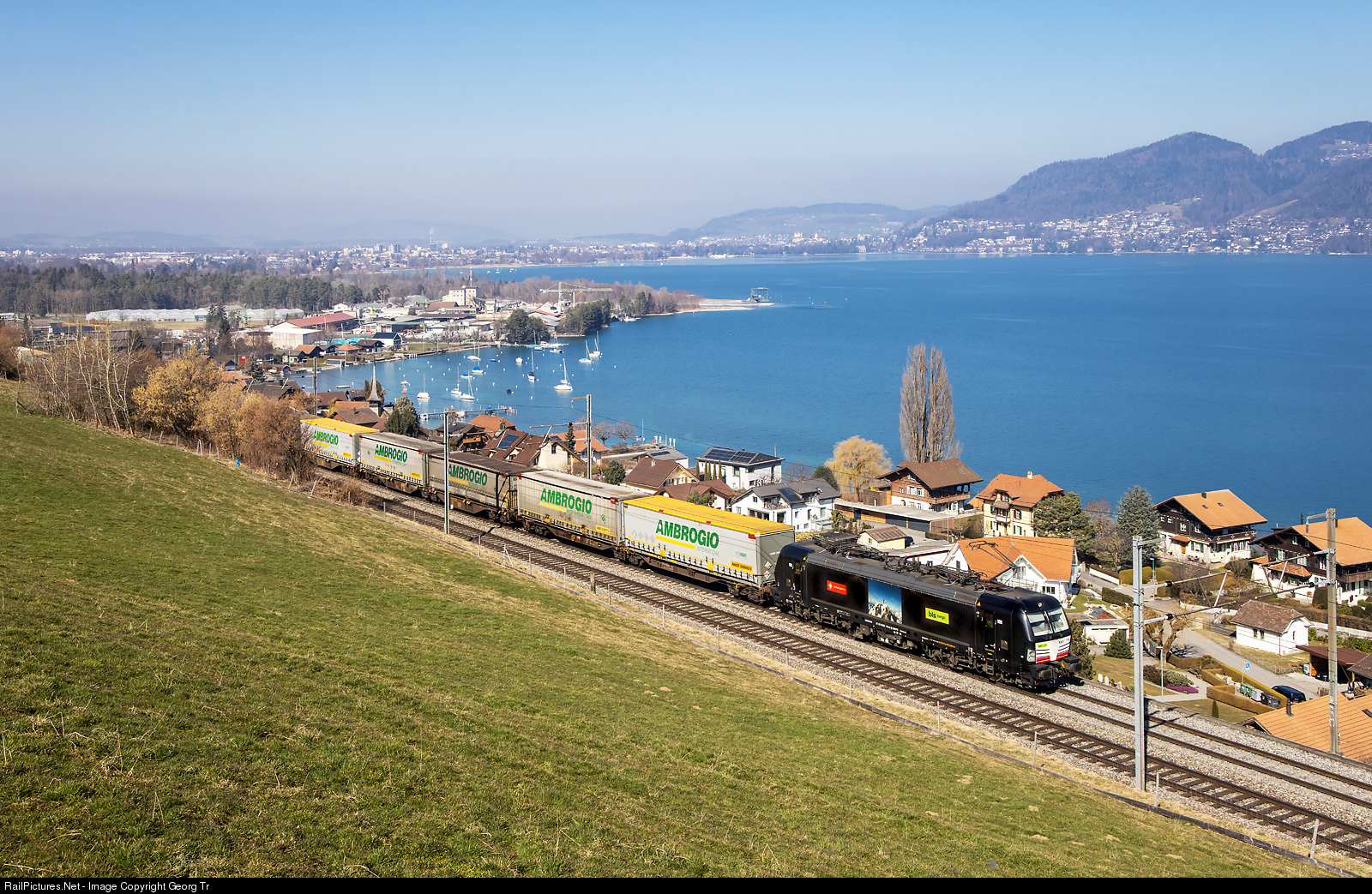 | Siemens Vectron MS 193 # 716 (X 4E # 716) of the Mitsui Rail Capital Europe (MRCE), rented to the BLS Cargo, is pulling the southbound Ambrogio intermodal train 69439 from Murgenthal via Lötschberg-Simplon to Domodossola freight yard between Gwatt and Spiez. The train was stabled in Murgenthal over the weekend. |