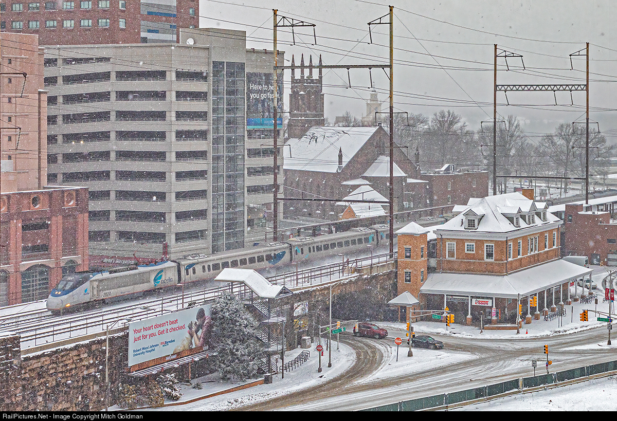 An Amtrak Acela Express flies through New Brunswick, NJ, in the midst of a mid-February snow squall. Heading west, bound for Washington D.C., the train, led by AMTK No. 2024, has just passed the historic 1903 PRR built station, which today is owned by NJT. Most of Amtrak's Northeast Corridor services bypass the station via the inner tracks, except for select Keystone Service and Northeast Regional trains and the weekday westbound Palmetto.