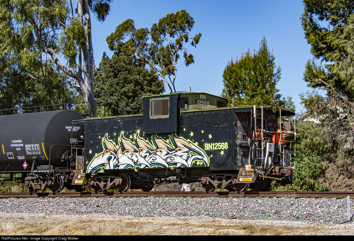 BNSF shoving platform BN 12568, wearing a neatly applied if unauthorized graffiti scheme (complete with clear and legible reporting mark and roadnumber), brings up the rear of local R-CAL0162-28 as it heads west on the railway’s San Bernardino Sub. This car was built by Pacific Car & Foundry in July 1973 as Burlington Northern wide-vision caboose 10769, which was rebuilt and renumbered BN 12568 in October 1990. This car has neatly applied (but still illegal) graffiti on each side, with each side painted very differently. This side has the word Amtrak, along with a rendering of Professor Frink from "The Simpsons." (Placentia, California – April 28, 2021). Click HERE to see the other side of this caboose.