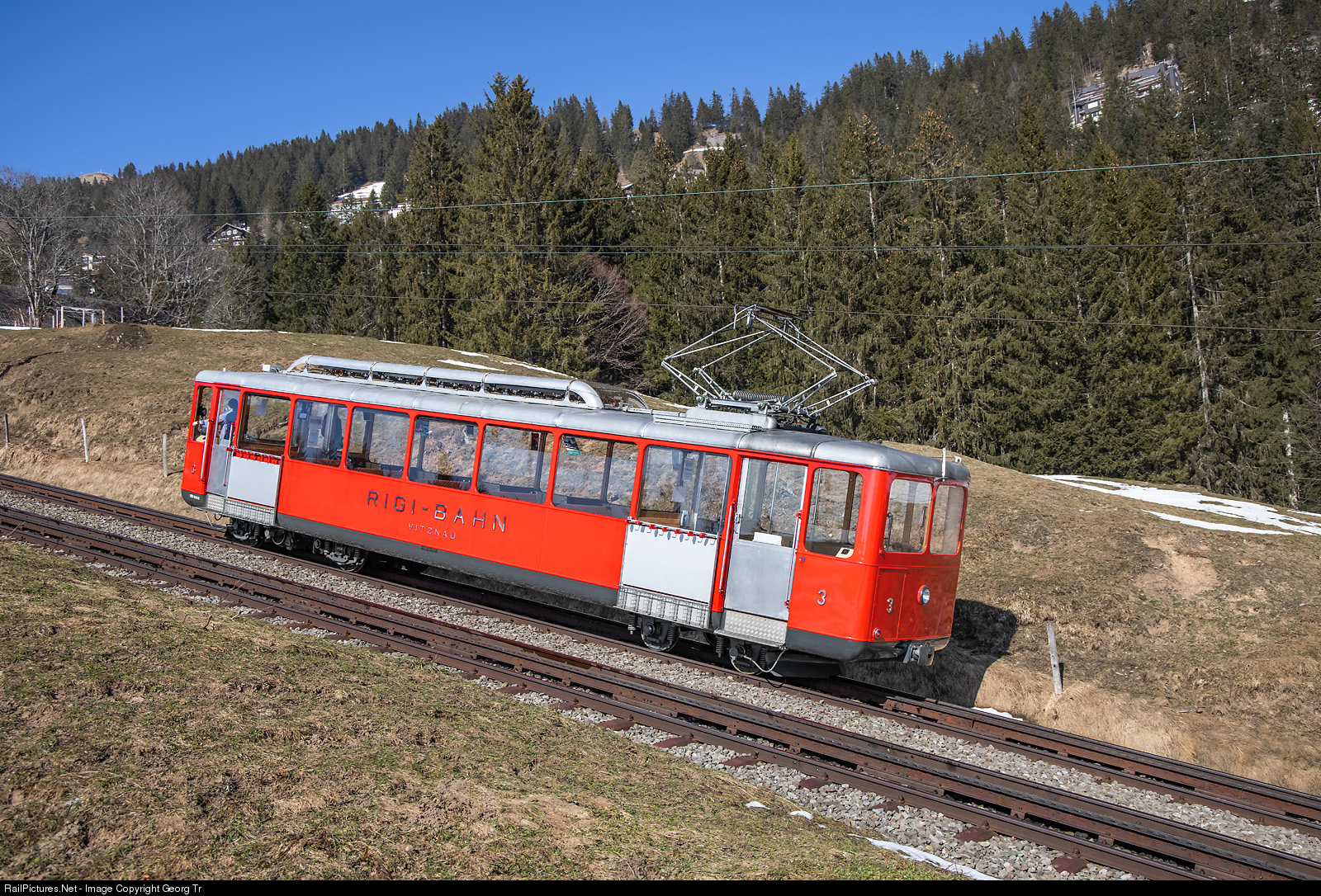 | Cogwheel railcar Bhe 2/4 # 3 of the Rigibahnen is running light as second train CC 1139 up the mountain between Romiti Felsentor and Rigi Kaltbad-First, to bring down passengers later. |
