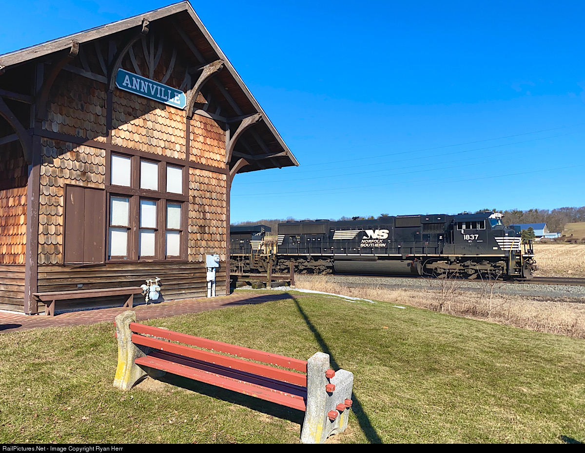 | NS 1837 emerges from behind the Annville station leading an eastbound stack train on a cloudless Sunday morning. Originally built in 1891 by the Reading Railroad, it was then restored and moved to it’s current location in 2000. |