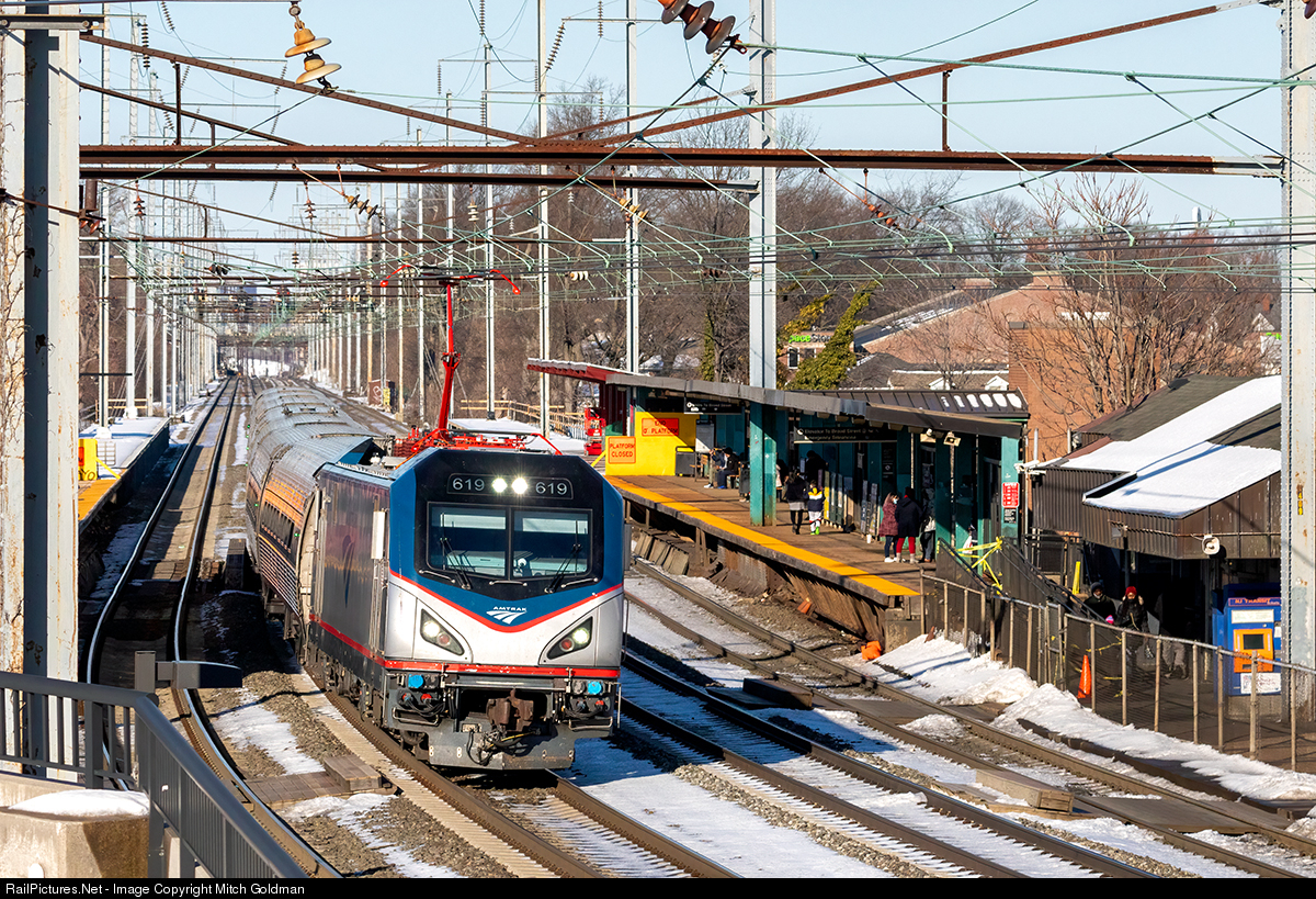 | AMTK No. 619 leads a Regional Express west through Elizabeth, NJ. Amtrak trains used to stop here but service was ended in 1973. The original station was built in 1835, though later replaced when the line was elevated in 1903. That depot was located on the westbound side (seen here in 1953 in a photo by John Dziobko), but destroyed in a fire in May of 1971. Work has commenced on a project to replace both the rebuilt inbound and outbound station shelters along with a rebuilding of the high level platforms extending each side to 300 linear feet to accommodate 12-car train boarding capacity. The improvements are part of a $71 million project to completely modernize Elizabeth Station. |
