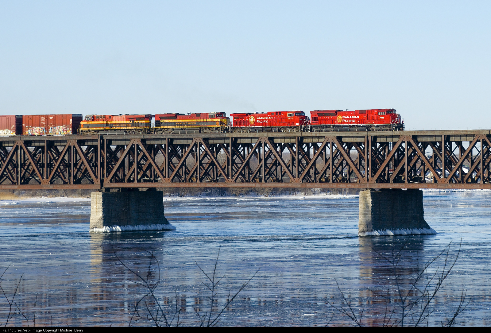 Beavers and Belles. CP 253 is crossing the St. Lawrence River with two CP and two KCS units, split between EMD's and GE's (CP 7033, CP 9633, KCS 4143 & KCSM 4677). At the end of the train are the empty tank cars of CP 651.