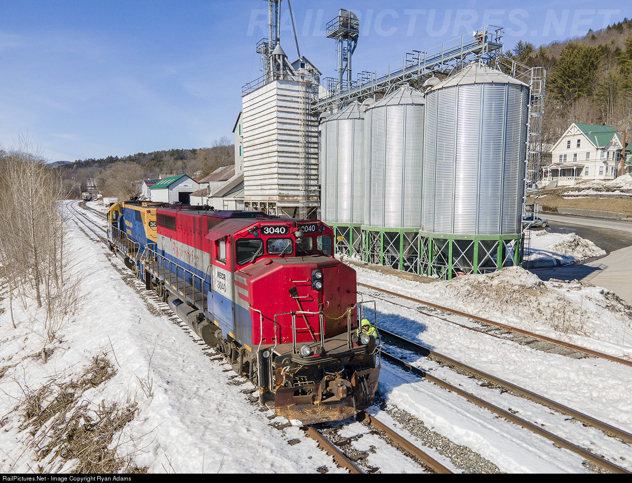 The NECR 3040 heads east down the Bethel siding track during the train run-around move before returning to WRJ. In the background is the Green Mountain Feed plant, one of only 2 railroad served industries between WRJ and Montpelier, VT.