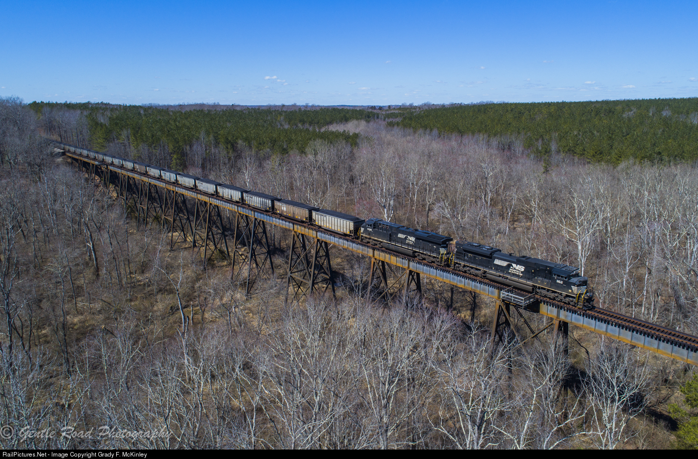 | The former Virginian Railway is famous for it's impressive bridges and trestles. In this image, train 820 (loaded coal for Lambert's Point) soars across the 1380 foot trestle over the East Branch Wards Fork Creek just east of Cullen, VA along the former Virginian Railway in Charlotte county, Virginia. |