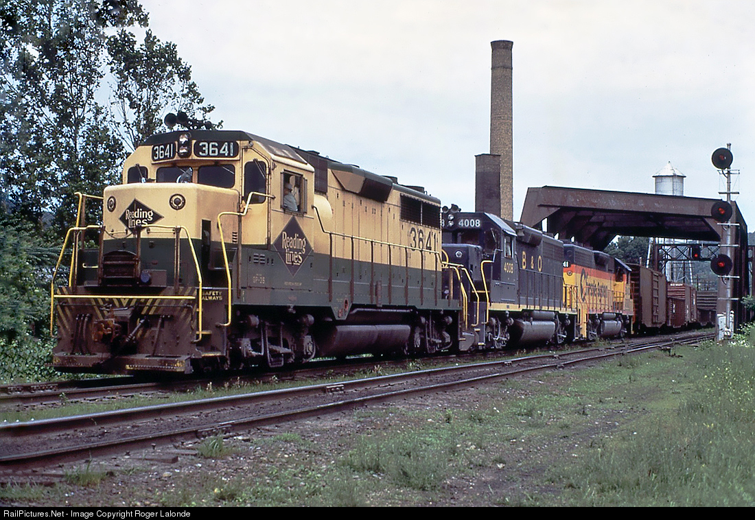 Departing Allentown yard, Reading GP35 3641 leading two B&O GP40's in June 1973. Photo from my collection, no photographer name on slide.