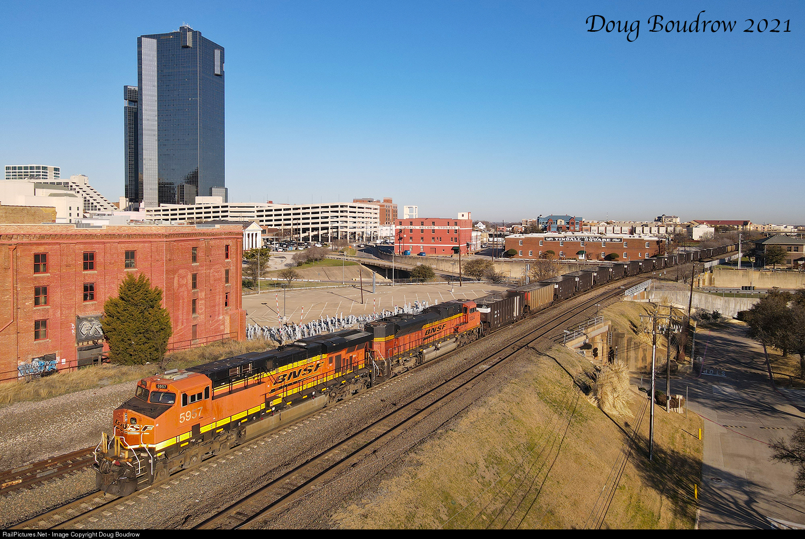 | The rear DPUs on a Northbound empty coal train are lit perfectly with the texas sun on a picture-perfect Sunday morning as the train passes downtown Fort Worth. |