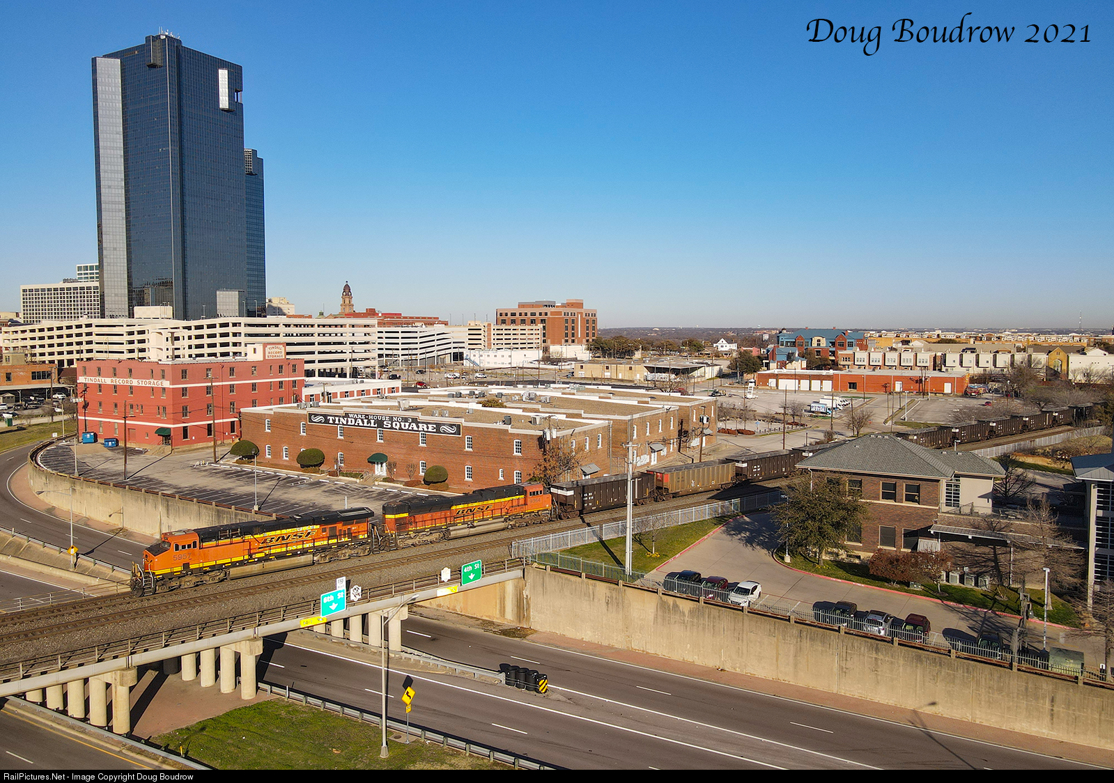 | The rear DPUs on a Northbound empty coal train are lit perfectly with the texas sun on a picture-perfect Sunday morning as the train passes downtown Fort Worth. |