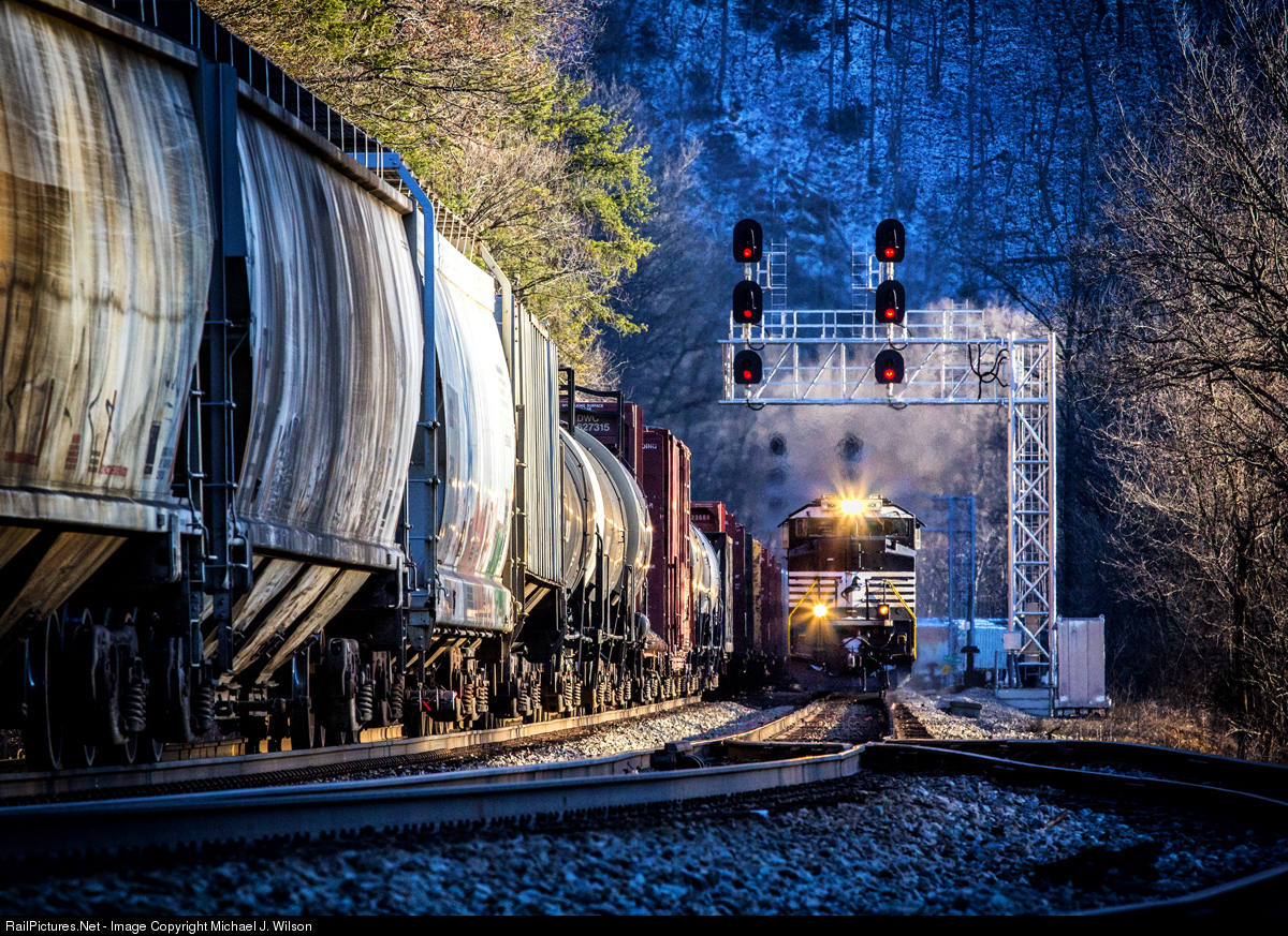 | Norfolk Southern SD70ACe #1101 speeds east at CP Glen Lyn on the late afternoon of February 20, 2021 as a westbound manifest freight occupies the southside main.