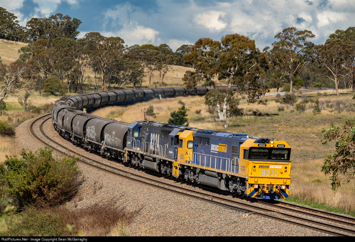 | Pacific National have been pumping out train after train of grain between the Cootamundra area and Port Kembla during the bumper 2020/21 harvest. Here, 8232 & 8224 haul 9327N empty grain through Goulburn bound for Cootamundra. |
