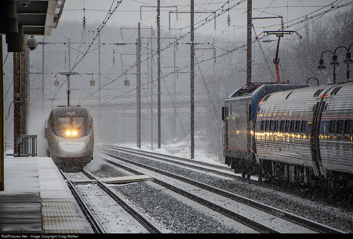 Amtrak Acela 2121 (New York NY to Washington DC, with power car 2026 leading) slows for its stop at the BWI Thurgood Marshall Airport Station during a heavy snowfall. Meanwhile, northbound train 178, a Washington DC to Boston MA Northeast Regional, behind ACS-64 658, loads passengers on the other platform. (Linthicum, Maryland – February 1, 2019)