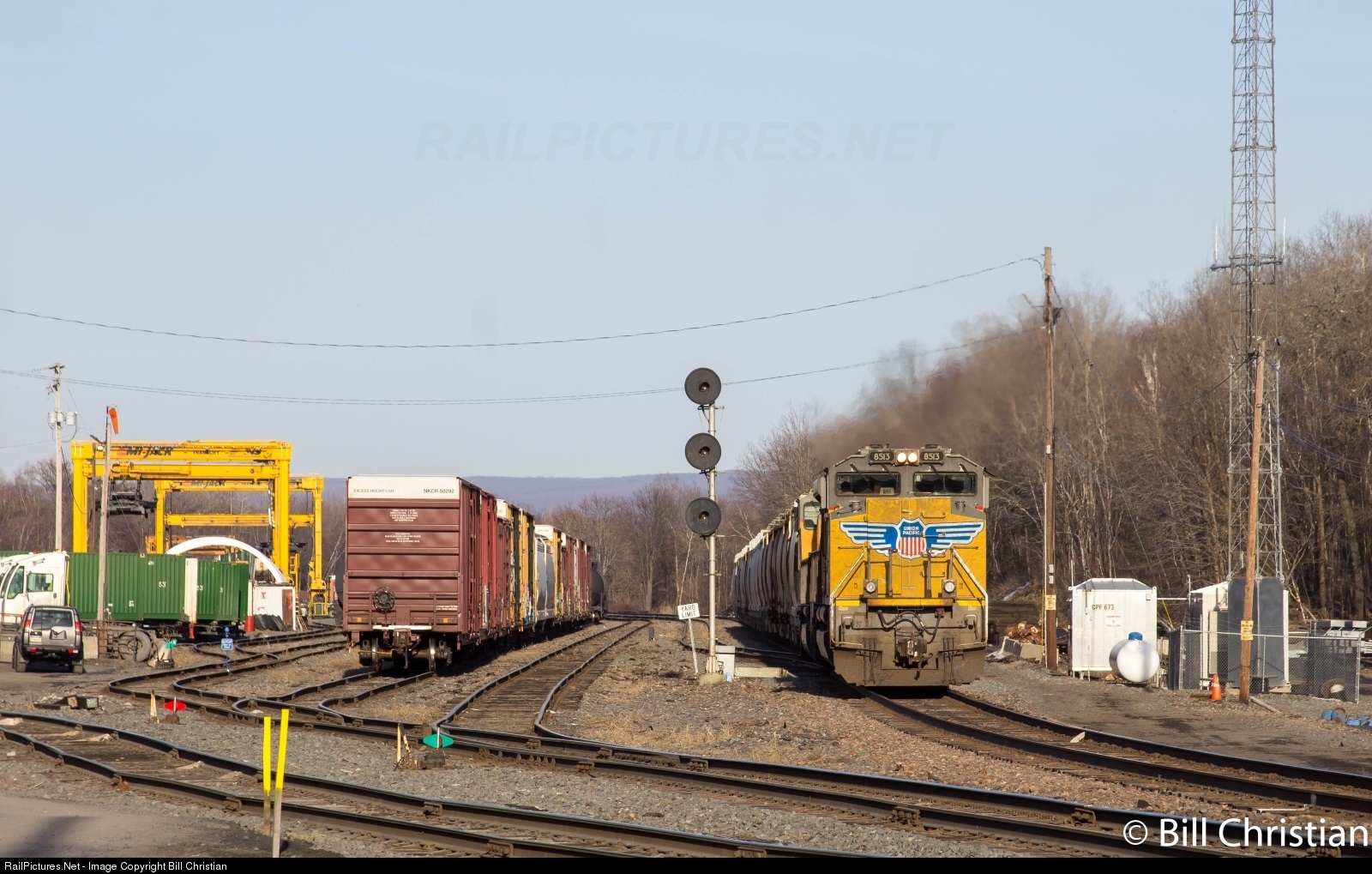 | NS K82 with a pair of Union Pacific EMD's shove north through Taylor Yard to serve the salt man. With a recent filing with the FRA, the searchlight signals may become a thing of the past on the former D&H. |