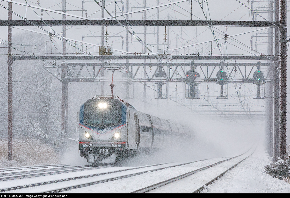 Ducking the former PRR signal bridge, AMTK No. 668 leads an eastbound Regional Express past the perforated 105 mph makers and though the storm in Eddington, PA.