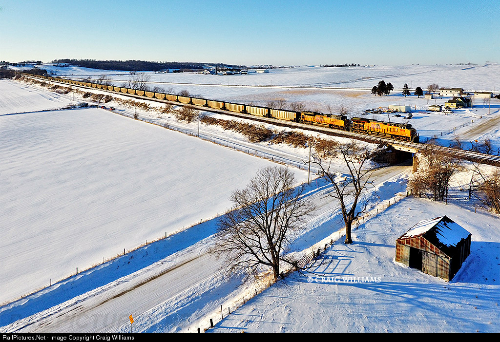 A North Antelope Mine, WY, to Romeoville, IL, coal load drops into the Prairie Creek watershed east of Belle Plaine. The train is working east on the UP Clinton Sub in central Iowa. This train will go to the CN at West Chicago who will deliver it to the Midwest Generation - Will County plant.