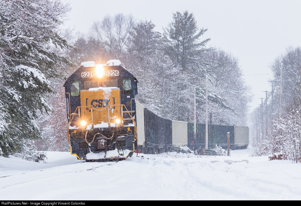 During a heavy snowfall, CSX B727 is seen reversing onto the Myles Standish lead in Taunton, MA with 24 empties for New England Recycling. Until 1965, trains had a straight shot to Mansfield using the track to the right. The line now only extends about 1.5 miles to serve a couple customers in the industrial park, while the line to Attleboro is still intact.