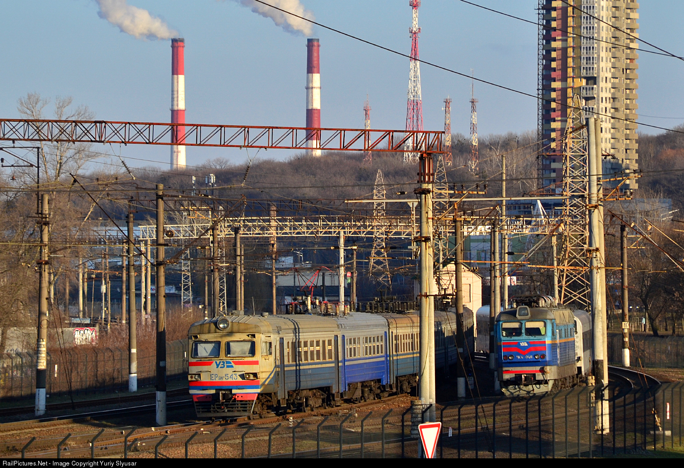 The electric train ER9M-543 is leading on a route #6918 Kyiv-Volynsky - Nizhyn towards east. While electric locomotive CHS4-046 is going towards Kyiv-Pasazhyrsky (west).