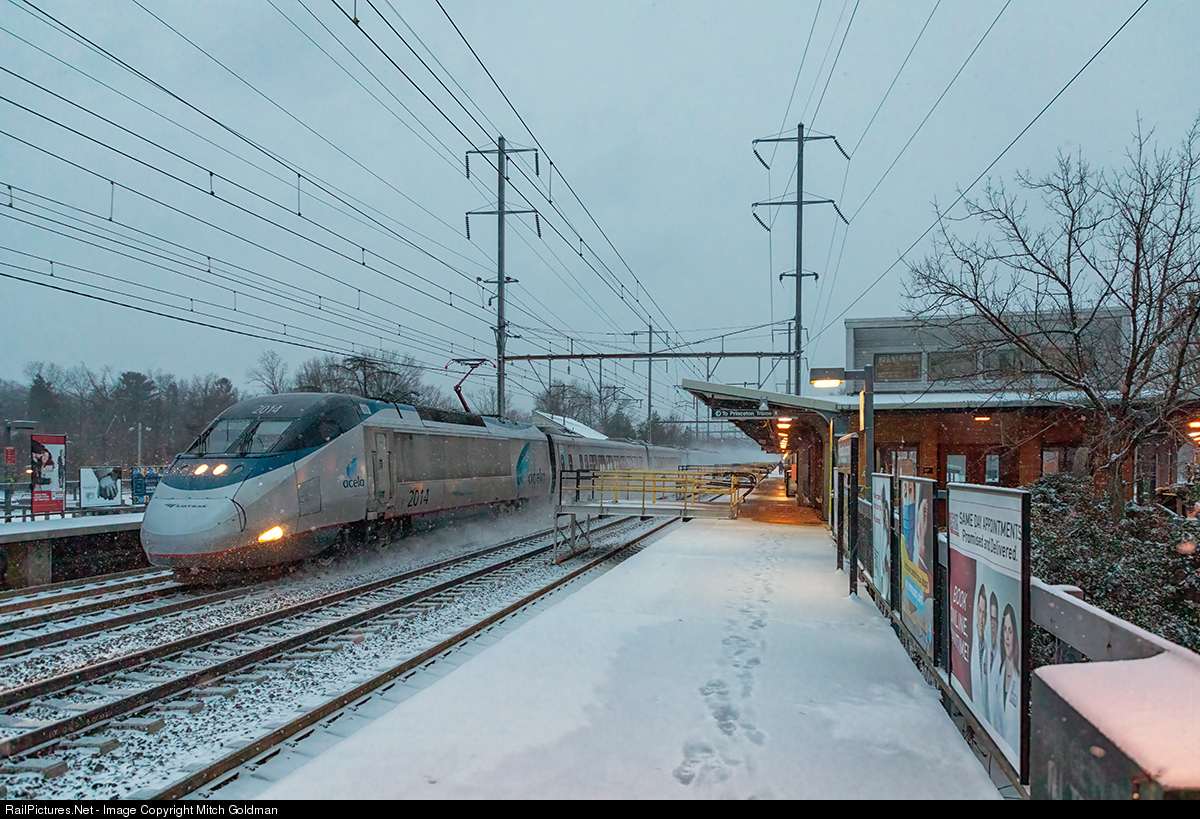 A sleek late evening Amtrak Acela Express flies through West Windsor, NJ passing a series of temporary platforms which were placed over track 4 to facilitate ongoing catenary and track work. The ongoing work is part of a project to to increase speeds and reliability along a stretch of track spanning from Hamilton, one station stop south) and New Brunswick, two stations north. Delayed several years, it is hoped that speeds on the inside tracks may be authorized for 160 mph by Fall of this year.