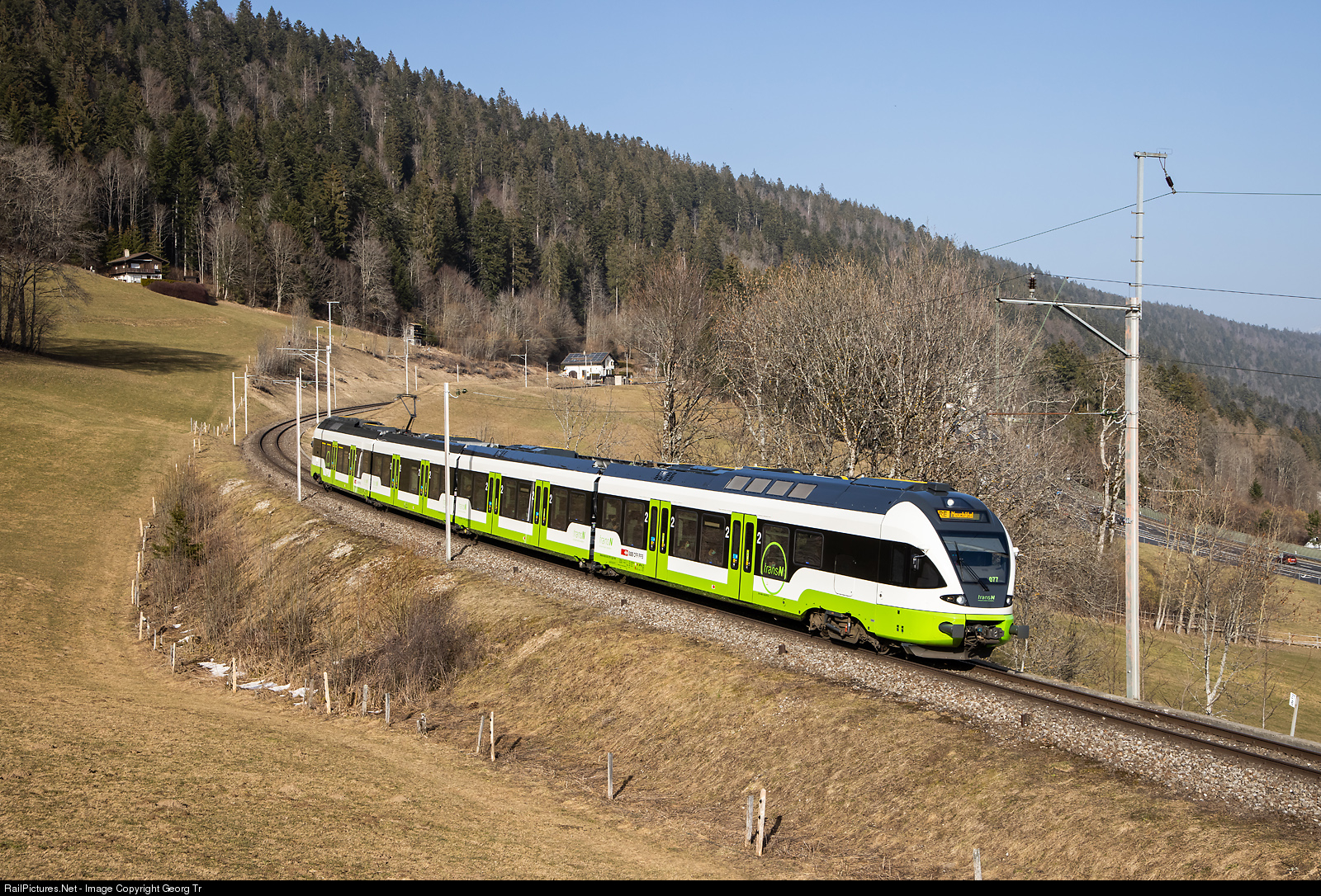 | "Flirt" RABe 523 # 077 of the transN (TRN) (Transports Publics Neuchâtelois) is running the Regio Express 3979 from La Chaux-de-Fonds to Neuchâtel, above Les Hauts-Geneveys. The train ran as Regio 7179 from Le Locle to La Chaux-de-Fonds before, and is operating on behalf of the SBB on this line. This "Flirt" (transN # 074 to # 077) was built together with other RABe 523 trains for the SBB by StadlerRail in 2017, and is different from the RABe 527 # 331 to # 333 (built 2007/2009). |