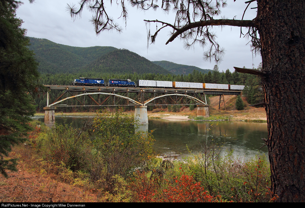 Powered by Montana Rail Link EMD GP9 Nos. 120 and 127, MRL’s Paradise local heads west over the Clark Fork on Bridge 208 west of Donlan, Montana, on September 29, 2014.