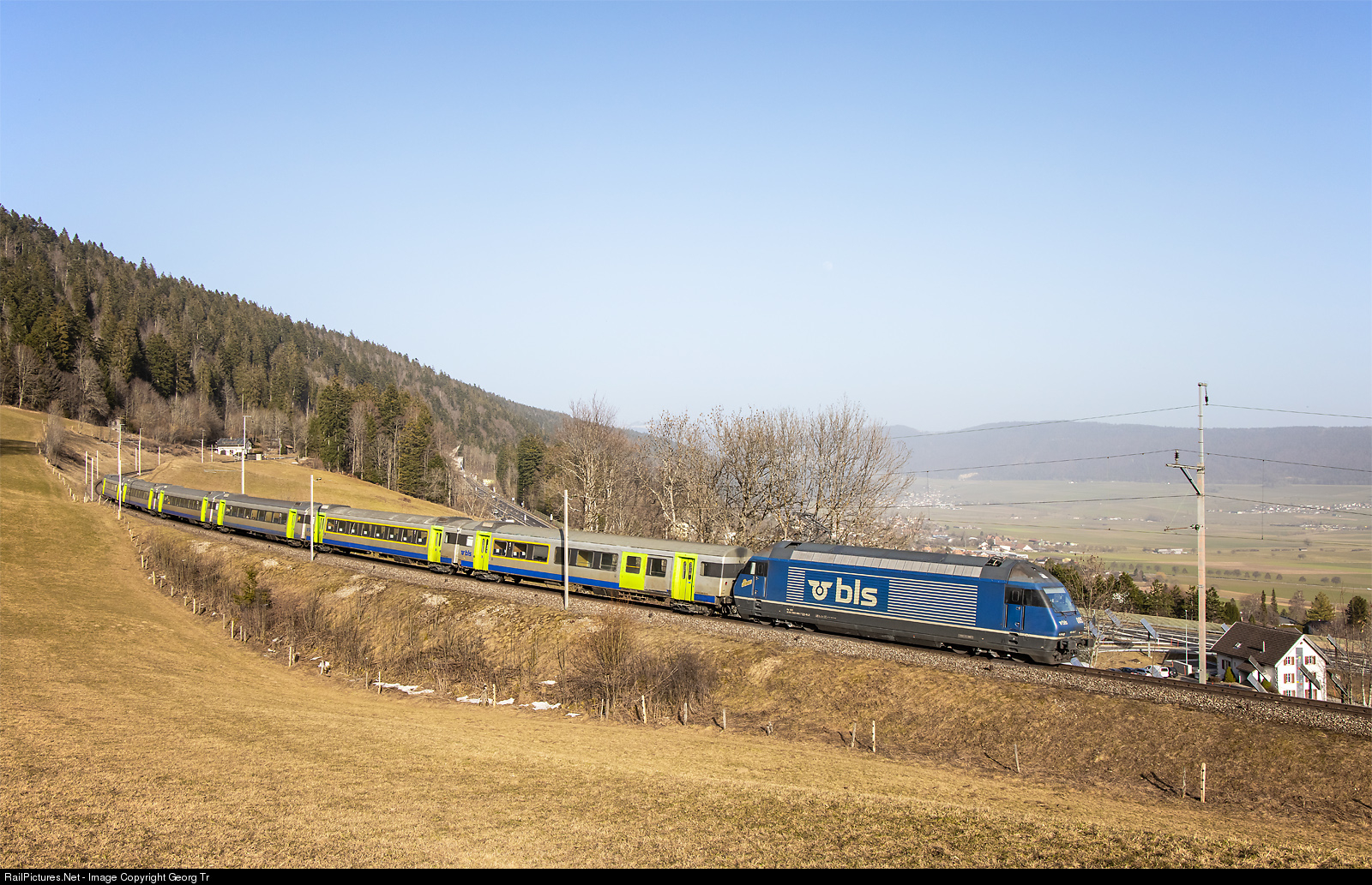 | Re 465 # 005 "Niesen" of the BLS is shoving the push-pull train with former SBB standard cars type III as Interregio 3926 of the line IR 66 from Berne via Neuchâtel to La Chaux-de-Fonds, above Les Hauts-Geneveys. The cars are former SBB standard type III ("Swiss Express") and will be withdawn soon. |