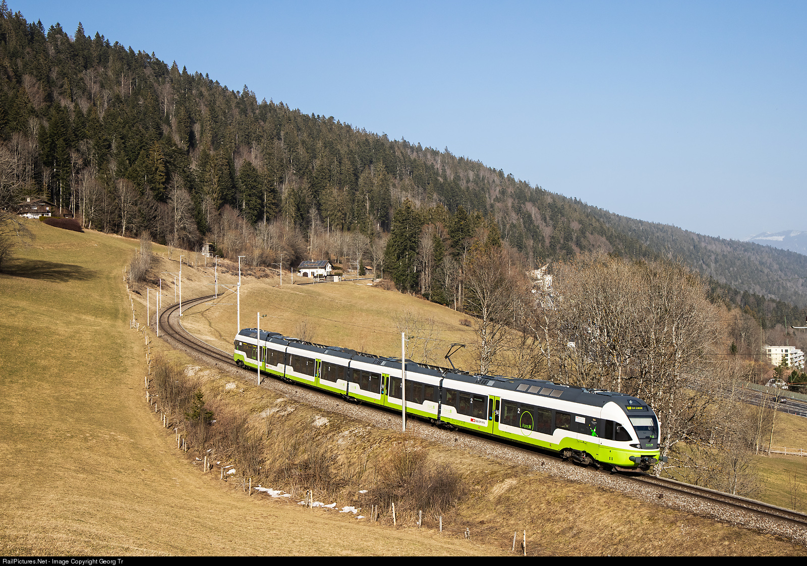 | "Flirt" RABe 527 # 333 of the transN (Transports Publics Neuchâtelois), in behalf of the SBB, is running the Regio Express 3976 from Neuchâtel via Chambrelien to La Chaux-de-Fonds, further as regional train to Le Locle, above Les Hauts-Geneveys. |