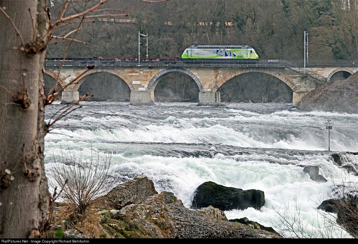 | BLS Re 465 001 with paint scheme "10 years Lötschberg Base Tunnel (LBT)" is crossing the Rhine Fall - Bridge with a diverted freight train from Singen (Germany) to Basel. |
