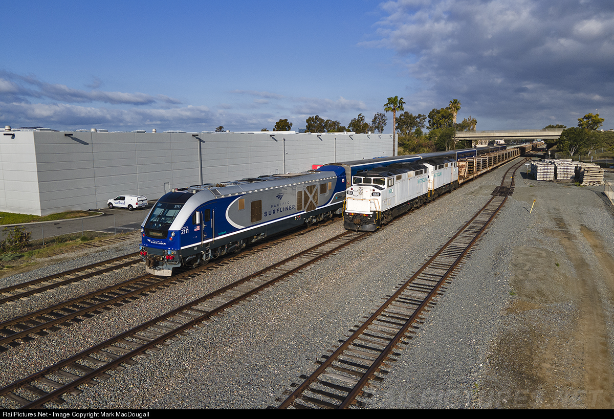 | A couple of the recently retired Metrolink F59PHRs have made a surprise reappearance as power for a rail train that is making a system wide tour to replace rail. After spending last night dropping rail between Fullerton and Santa Ana, the Metrolink Work Train is tied down on the siding between CP-El Toro and CP-Bake in Irvine as it awaits another assignment tonight. Meanwhile, Amtrak 1584 passes as they prepare to double back and layover at the other end of the siding. Due to track work on the NCTC San Diego Sub, Amtrak service is terminating in Irvine this weekend. |