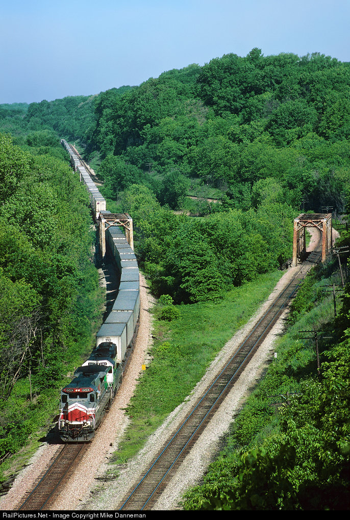 On the morning of June 5, 1993, Burlington Northern’s train 4, led by LMX GE B39-8 No. 8540, rolls eastbound over one of the Sinsinawa River truss bridges at milepost 172 west of Portage, Illinois. This location is on the BN main line along the Mississippi River between Savanna and East Dubuque, and at that point, is a joint operation with Chicago Central between Portage and East Dubuque. Before CC, it was Illinois Central Gulf (formerly IC), and at one time, the tracks were also used by Chicago Great Western on trackage rights.