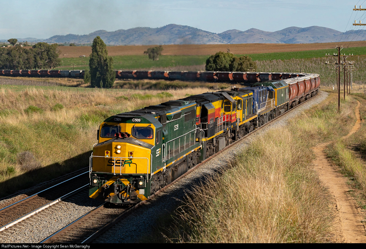 | An impressive SSR lashup of C509, BRM001, 602, 1201 & RL302 races through Cunningar with 9343N empty grain train from Port Kembla. The train then stabled at Cootamundra North while the locos went into Cootamundra yard for refuelling before taking the train on to Narromine. |
