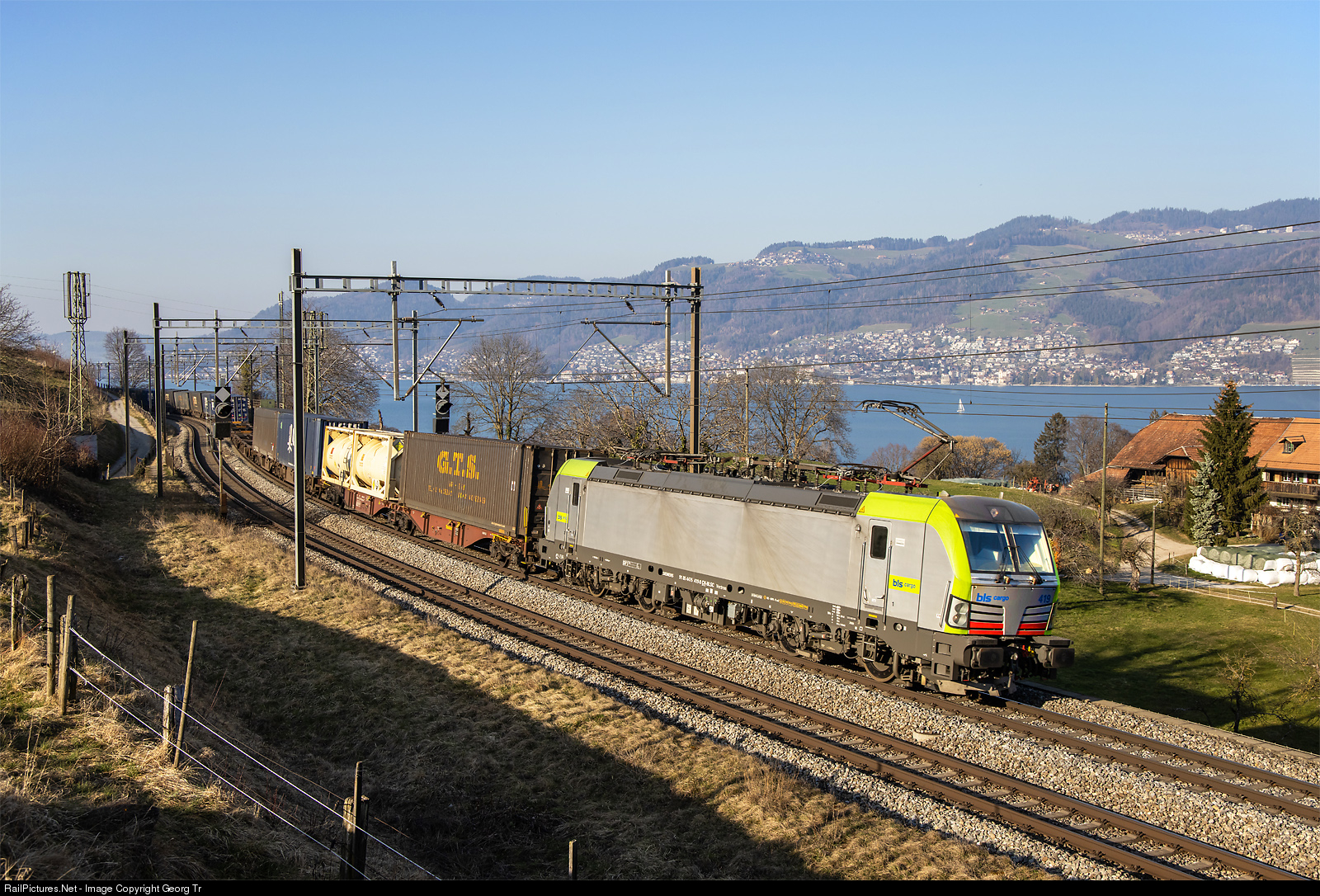 | Siemens Vectron Re 475 # 419 of the BLS Cargo, rather new (delivered in september 2020) but very durty, is pulling the southbound intermodal train 43525 from Zeebrugge-Ramskapelle/Belgium via Lötschberg-Simplon to Piacenza/Italy, along Lake Thun between Gwatt and Spiez. |