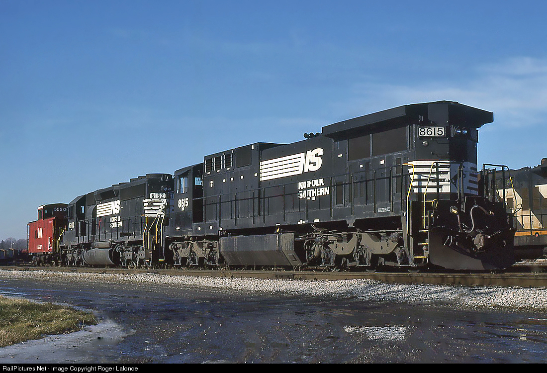 Norfolk Southern GE C39-8 8615, NS SD40-2 6162 and a NW caboose at St. Thomas, Ontario NS Yard. C39-8 8615 is equipped with bi-directional control stands, a snow plow is located on each plot with the long hood designated as front.