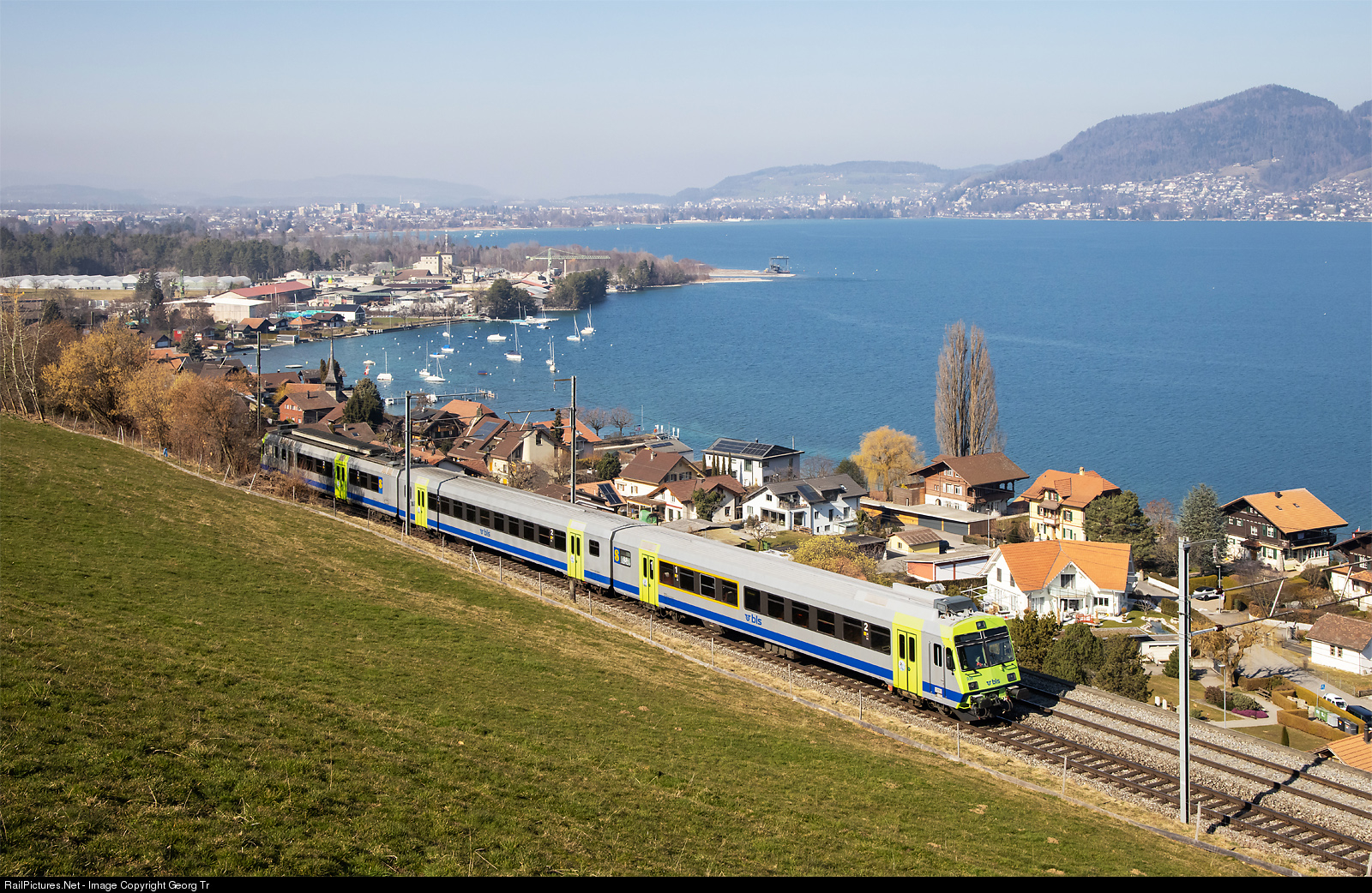 | Push-pull train of the BLS, with railcar RBDe 566 # 238 and cab car ABt # 938 in the rear, is running light along the Lake Thun from Spiez to Thun as train 28464. This "NPZ"-trains will be scrapped in the next years, replaced by the new MIKA RABe 528. |