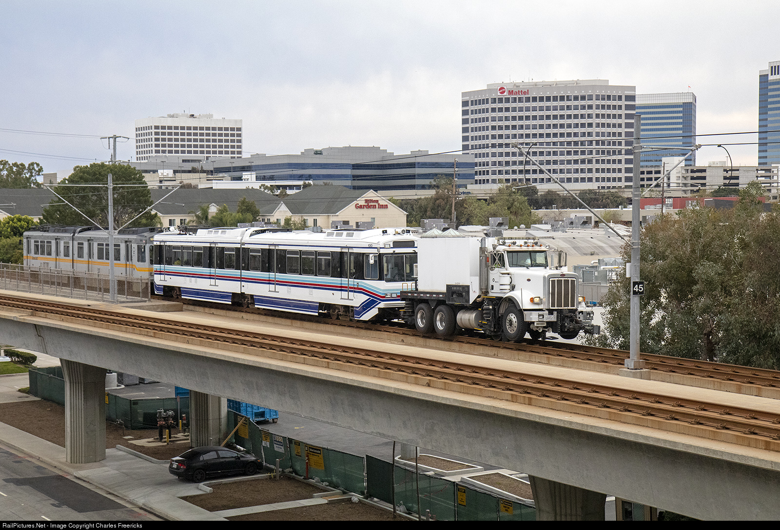 A Metro Rail work train is behind a Brandt truck as it is going to be moving from the Green Line (now the C Line) to the brand new Crenshaw Line, pulling Metro Rail's very first car, retired P865 100, restored to original paint scheme for eventual donation to the City of Long Beach, and retired P2020 165 to the new yard near LAX.