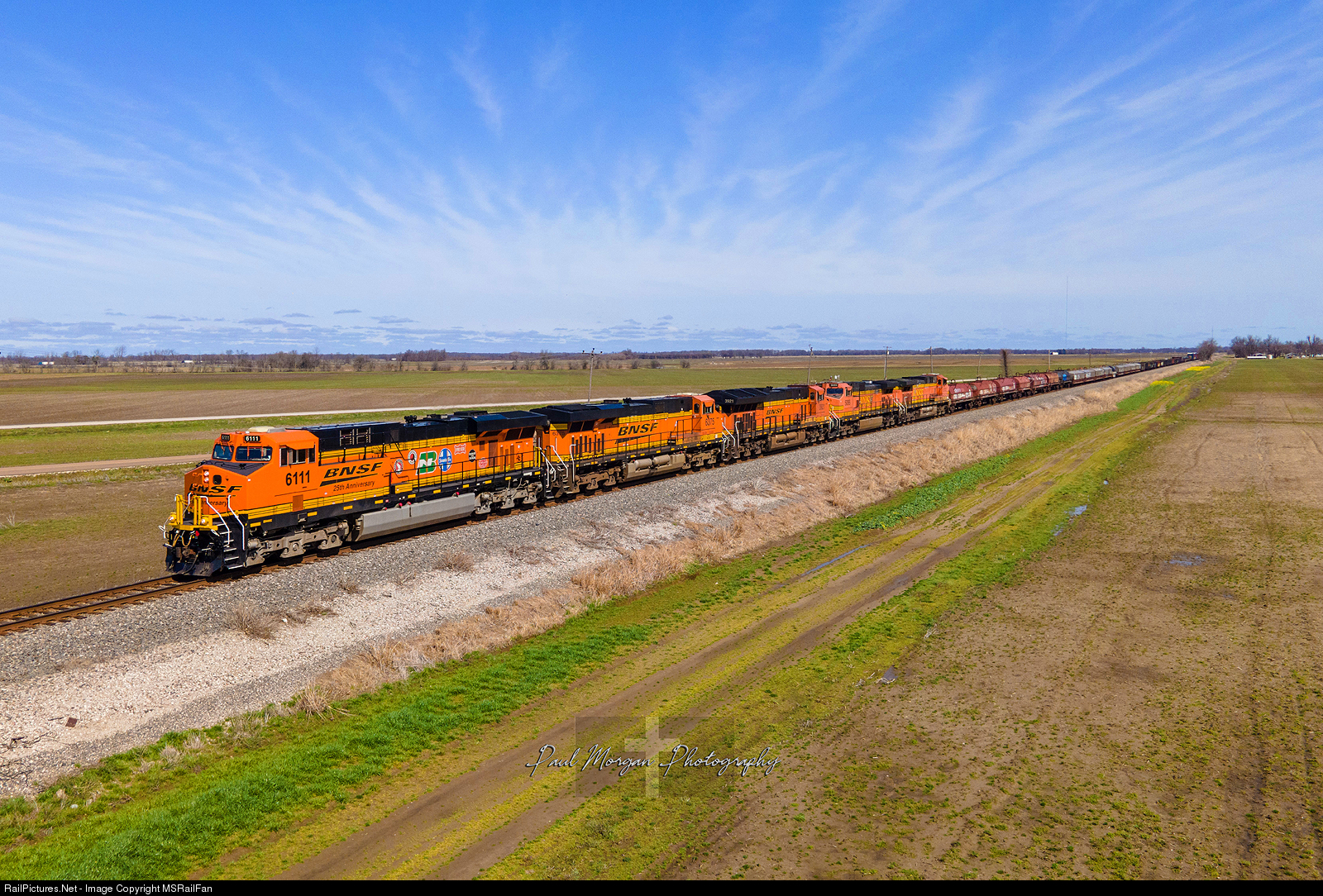 | BNSF sticker unit #6111 came into the Memphis area leading a short manifest. It was nice to see it still relatively clean! In this photo, it comes into the north side of the very flat Turrell, AR. |