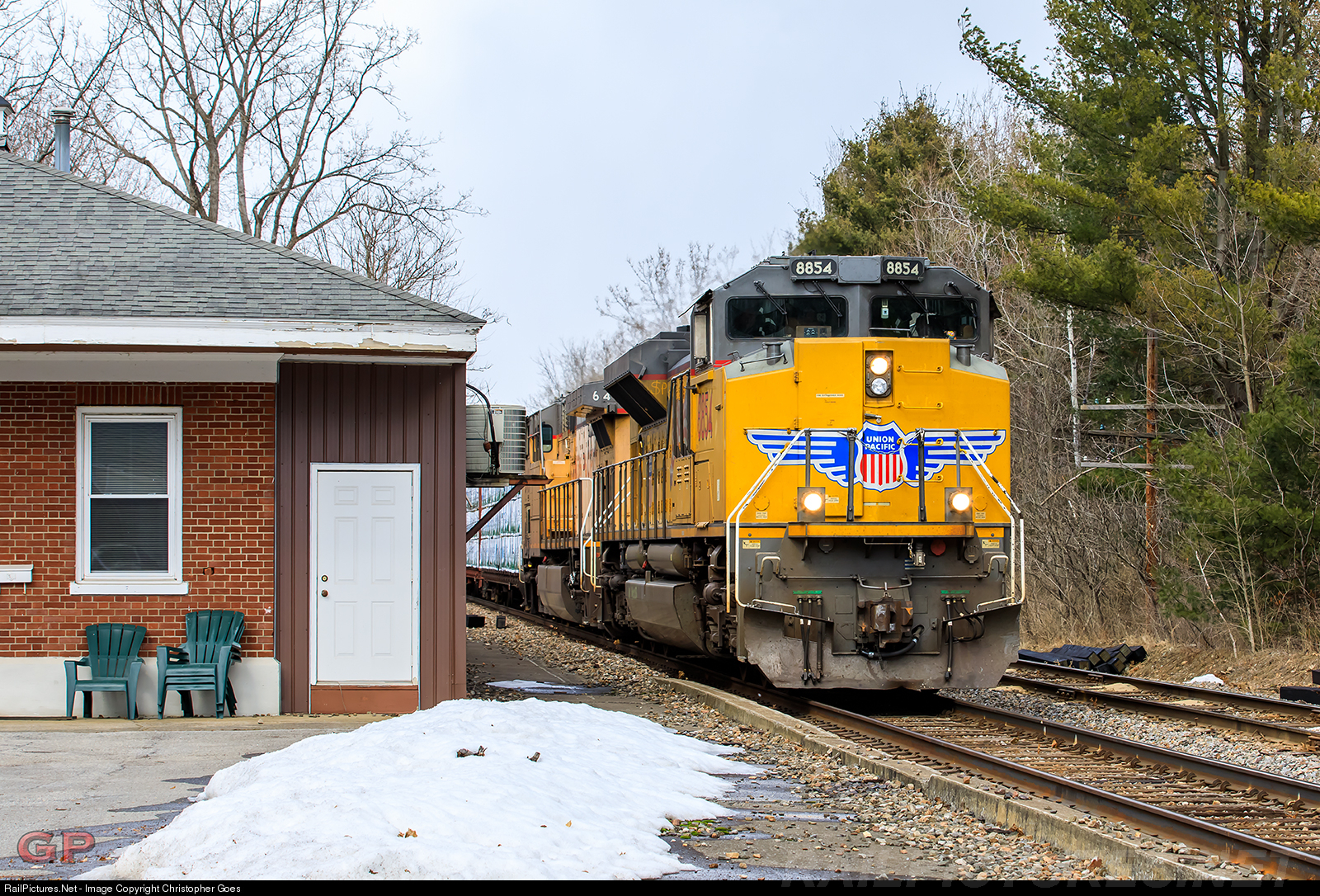 | UP ACe 8854 pulls the CP-930/NS-30T south through Ballston Spa passing the old D&H station with just enough light hence the clouds were playing games with the sunlight throughout the day. The NS re-crew was done after work was completed in Saratoga where it used to be done at this location. 930/30T later had too slow down and pace themselves since the 11R snuck out in-front of them in Burnt Hills. |