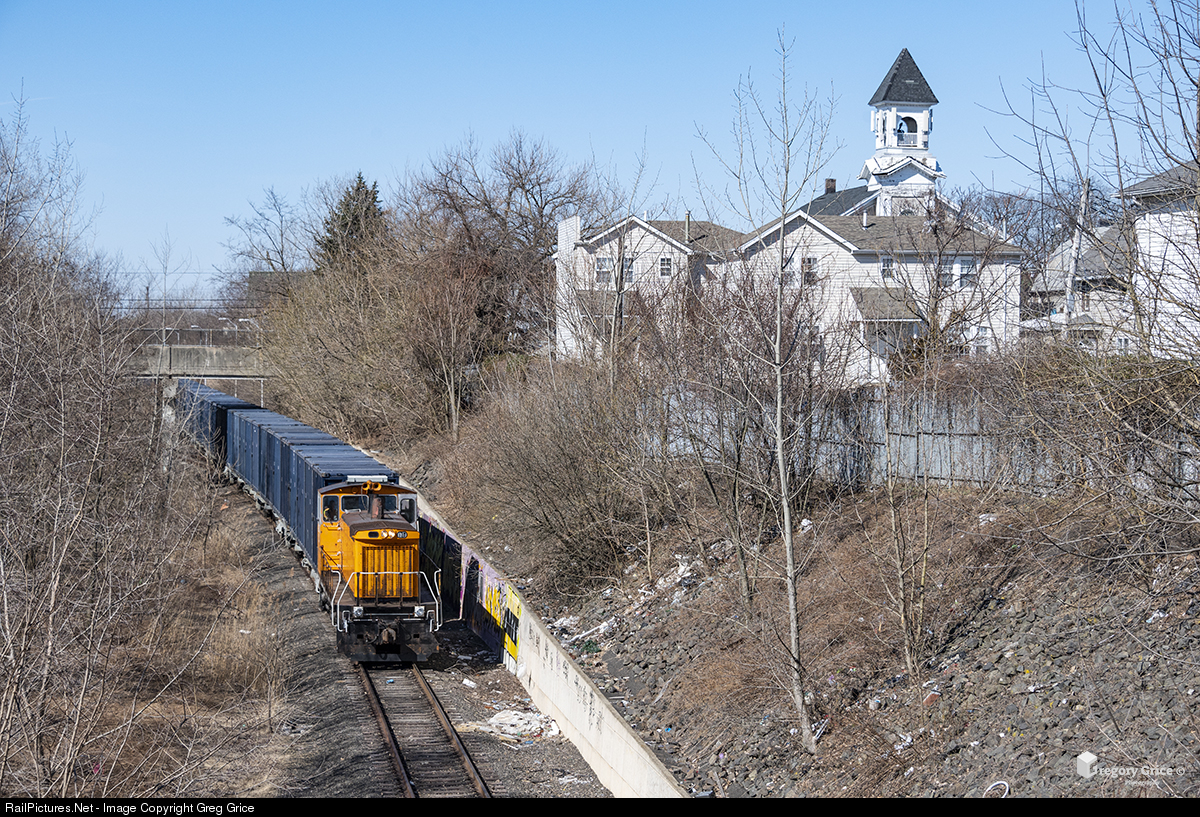 The New York Container Terminal (NYCT) Express Rail train, with GMTX 173 leading, pulls a cut of garbage cars to far east end of what remains of the Staten Island Railway's North Shore Branch. Staten Island's Summerfield United Methodist Church stands in the background. The North Shore Branch was opened in February 1886 and operated along Staten Island's North Shore from Saint George to Port Ivory. Passenger service ended in March of 1953, and freight service ended sometime in 1989 when the line was abandoned. In 2005, freight service on the western portion of the line in Arlington was reactivated for container traffic. This included the Arthur Kill Vertical Lift Bridge, Arlington Yard and a small single track portion of the branch on the east end of the yard to use for headroom (pictured).