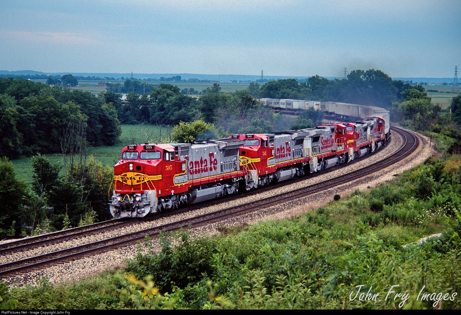 Back in the days of red and silver, or yellow and blue... the latest and greatest, a matched set of 5 B40-8Ws race the hottest train on the railroad around Houlihan's curve and up Edelstein hill.