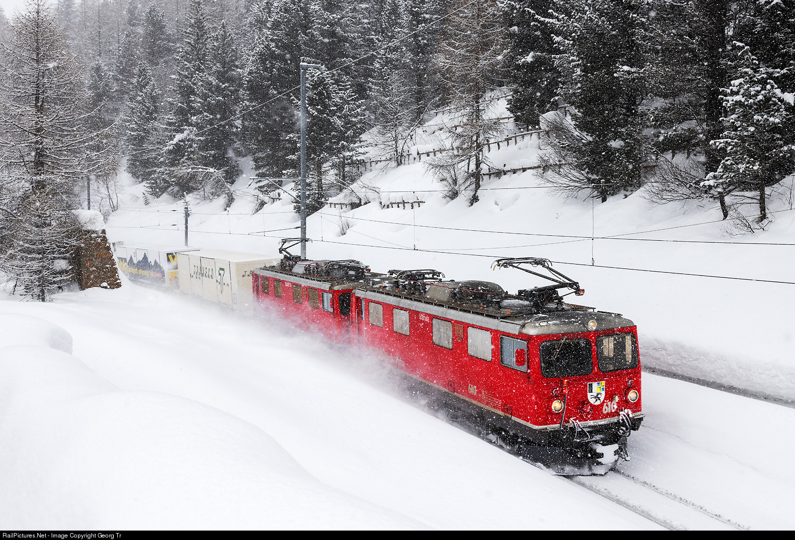 | Ge 4/4 I # 610 and # 605 of the Rhaetian Railway in multiple control, are pulling the freight train from Pontresina over the Albula line to Landquart, between Bever and Spinas. Both locomotives were built in 1953! |