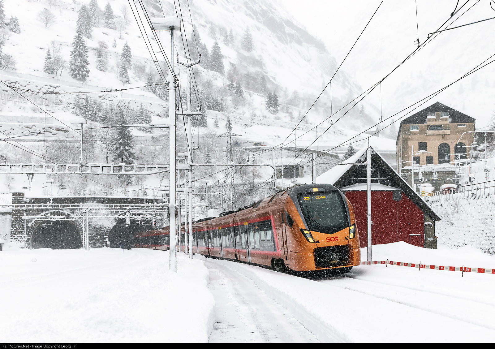 | "Traverso" train RABe 526 # 111/211 of the Südostbahn (SOB), running as "Treno Gottardo" IR 2414 of the line IR 46 from Bellinzona over the Gotthard mountain line to Zürich, is leaving the 15 kilometer long Gotthard tunnel and entering Göschenen, on 1106 meter a.s.l. Winter came back about 2 days ago. |