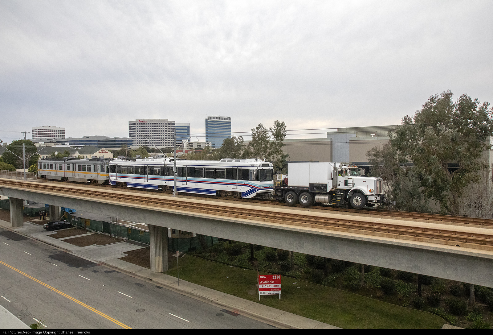 A Metro Rail work train is behind a Brandt truck as it is going to be moving from the Green Line (now the C Line) to the brand new Crenshaw Line, pulling Metro Rail's very first car, retired P865 100, restored to original paint scheme for eventual donation to the City of Long Beach, and retired P2020 165 to the new yard near LAX.