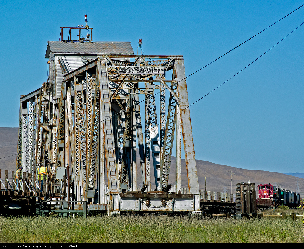 Another view from my Covid gallery of trains close to home over the past year. This is number four of the series. The NWP crosses four moveable bridges in its short run from the Cal Northern interchange at Lombard to the feed mills in Petaluma. This is the oldest, dating from 1910 and in continuous use for 110 years. It crosses the Petaluma River at Blackpoint. In this view a westbound train waits for the bridge to close. It had been closed waiting for the train, but a couple small boats came along and the bridge had to open, delaying the train. Boats have the right of way. But it gave me an chance to get this picture. In the old days the bridge tender (and trainorder operator) had to row out to the center pier to climb up into the control room, but today remote controls have been placed at the Novato end of the bridge making the operation much easier. The bridge has survived numerous barge strikes and seems to still work pretty well, except during hot weather it gets a bit cranky.