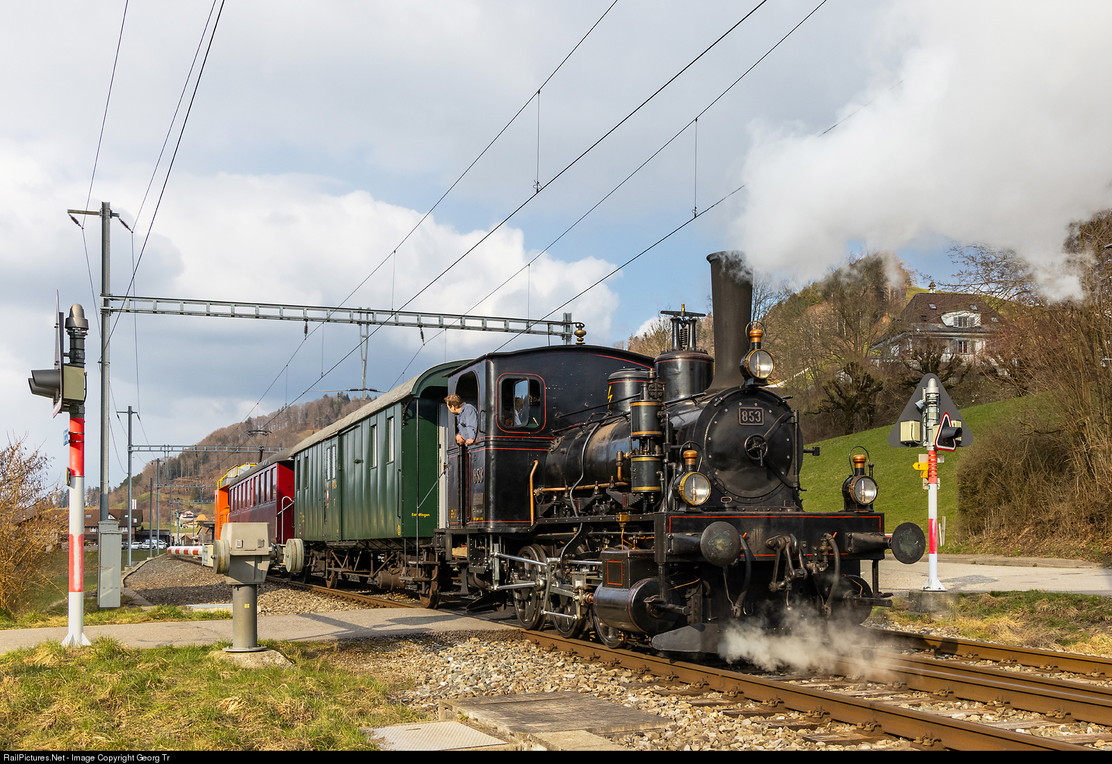Test run of steamlocomotive E 3/3 # 853 of the Dampfbahn Bern (DBB) in Walkringen. The locomotive E 3/3 # 853 belongs to a series of 4 locomotives which were put into service in 1890 at the Jura Simplon railroad. It is a replica of the locomotives # 851 and #